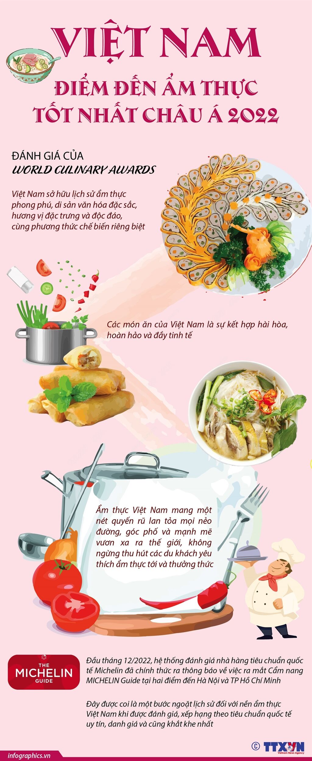 Theo Tổng cục Du lịch: Ẩm thực là một nét tinh hoa trong văn hóa truyền thống của người Việt Nam. Ẩm thực Việt phong phú từ nguyên liệu, tinh tế ở khâu chế biến, mỗi một vùng miền lại có thói quen ăn uống khác nhau, tạo nên những hương vị đặc trưng riêng biệt. Nên không ngạc nhiên khi các món ăn Việt lại được các thực khách quốc tế ca ngợi và đánh giá cao.
