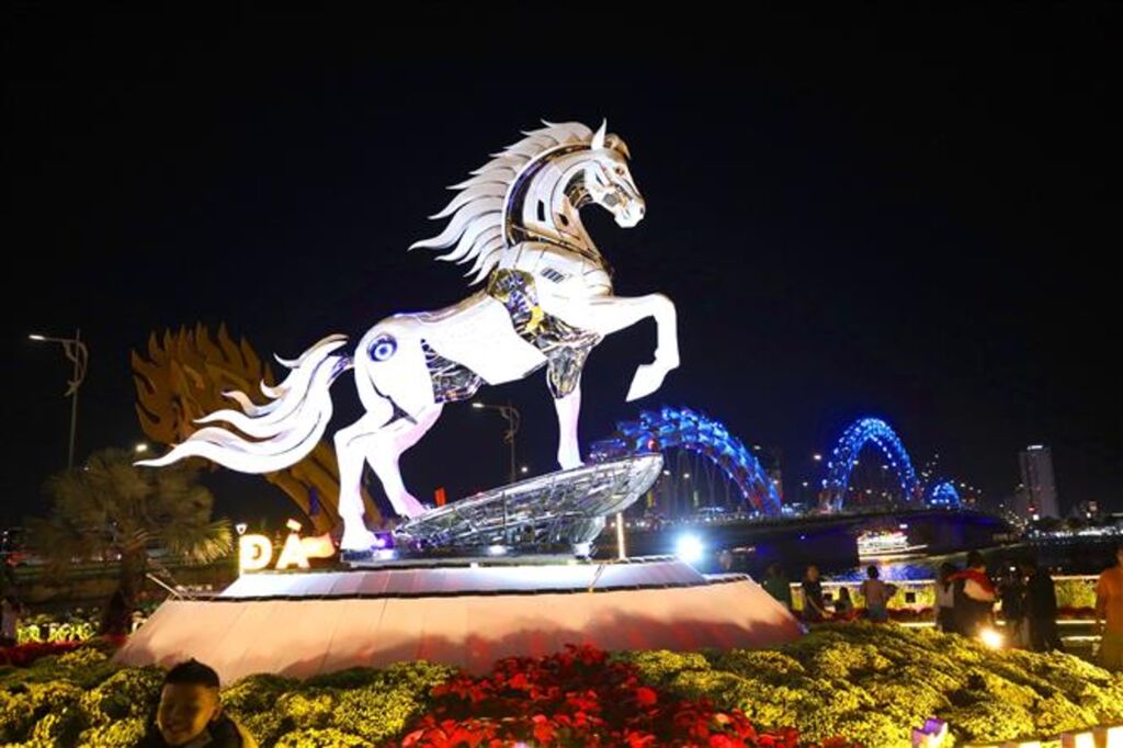 Cũng tại Đà Nẵng, linh vật “Kim mã 4.0” đặt tại sàn cảnh quan phía Nam cầu Rồng cho thấy xu hướng hiện đại hóa hình tượng linh vật. Với tạo hình ngựa mạnh mẽ, kết hợp hệ thống đèn LED và ngôn ngữ tạo hình công nghệ, tác phẩm mang hơi thở của thời đại số, thể hiện khát vọng đổi mới, sáng tạo và hội nhập. Việc đặt tên “4.0” cho linh vật cho thấy cách các địa phương đang chủ động làm mới biểu tượng truyền thống, đưa linh vật bước ra khỏi khuôn mẫu quen thuộc để trở thành điểm nhấn thị giác, thu hút giới trẻ và du khách.