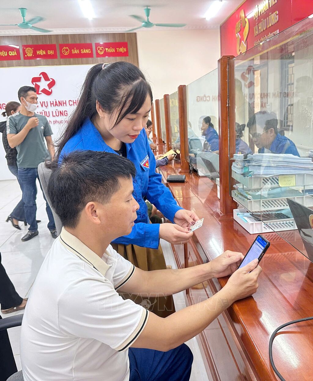 Tại các trung tâm phục vụ hành chính công đoàn viên, thanh niên đã kịp thời có mặt hướng dẫn người dân xếp hàng, lấy số thứ tự, thao tác trên máy tính, điện thoại thông minh để nộp hồ sơ trực tuyến.