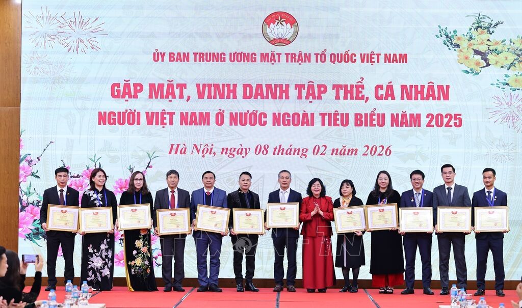 Trưa 8/2, tại Hà Nội, Ủy ban Trung ương Mặt trận Tổ quốc Việt Nam tổ chức gặp mặt, vinh danh các tập thể, cá nhân người Việt Nam ở nước ngoài tiêu biểu năm 2025. Bà Bùi Thị Minh Hoài, Ủy viên Bộ Chính trị, Bí thư Trung ương Đảng, Bí thư Đảng ủy Mặt trận Tổ quốc, các đoàn thể Trung ương, Chủ tịch Ủy ban Trung ương Mặt trận Tổ quốc Việt Nam chủ trì buổi gặp mặt.