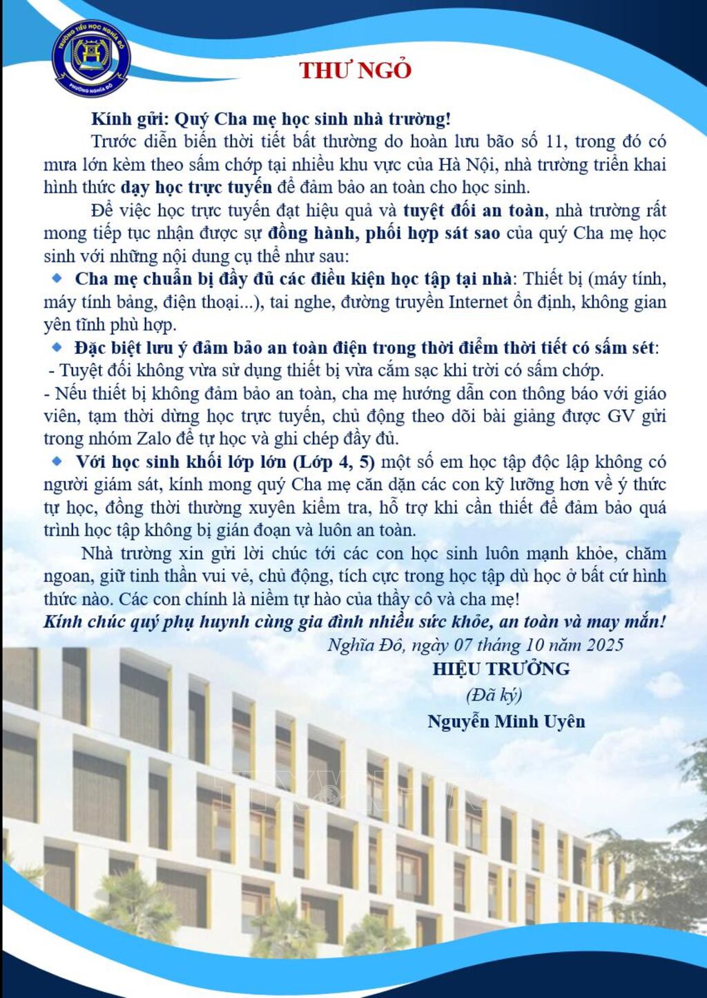 Căn cứ Thông báo số 3 của Sở Giáo dục và Đào tạo Hà Nội về việc chủ động ứng phó với mưa lớn do hoàn lưu bão số 11 (Matmo) và căn cứ vào diễn biến thời tiết thực tế, Trường Trung học cơ sở Chu Văn An (phường Tây Hồ) cũng thông báo tới toàn thể phụ huynh, học sinh về việc tổ chức dạy học trực tuyến ngày 7/10.