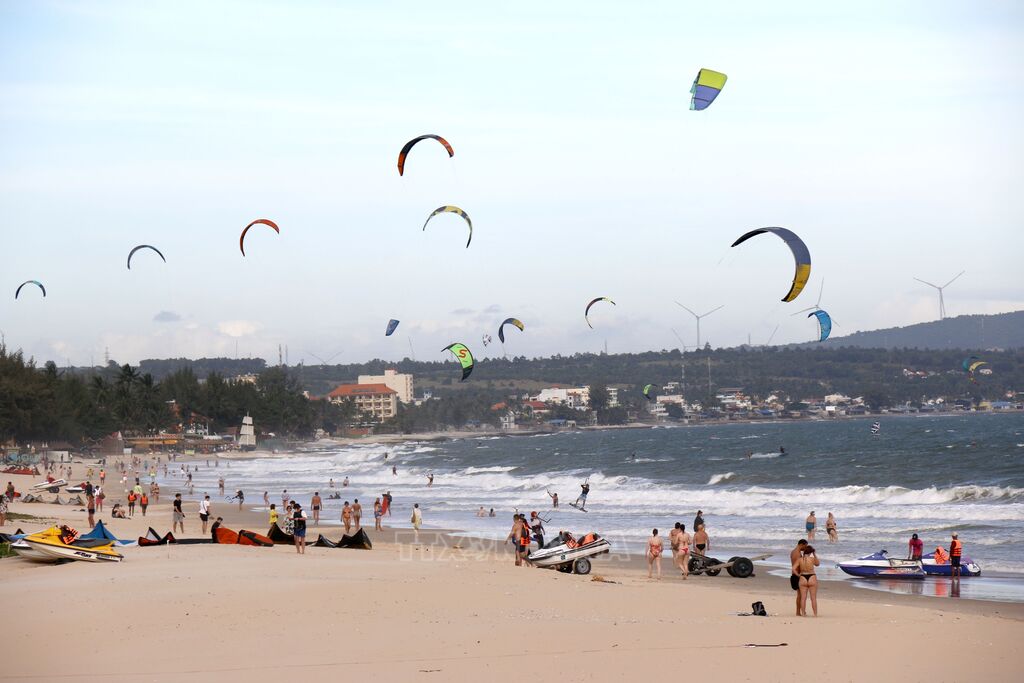 Dọc bờ biển Hàm Tiến - Mũi Né mùa này luôn rộn ràng từ trưa đến cuối buổi chiều. Trên bãi cát trắng trải dài, những người chơi chuẩn bị diều, kiểm tra dây, trao đổi nhanh với huấn luyện viên trước khi lao ra biển. Khi gió căng diều, người chơi lướt nhanh trên mặt nước và bay lên khỏi mặt sóng, thực hiện những cú nhào lộn đẹp mắt trong tiếng gió rít và sóng vỗ. Với nhiều người, cảm giác được "bay" giữa trời và biển, làm chủ gió và sóng, là trải nghiệm khó quên mà không phải nơi nào cũng mang lại được.