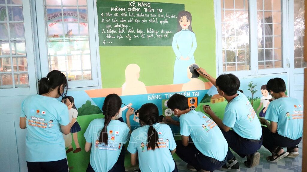 Bên cạnh đó, dự án tổ chức các hoạt động ngoại khóa như vẽ tranh tường “Sẵn sàng trước thiên tai và biến đổi khí hậu” và cuộc thi Rung chuông vàng “Cùng em phòng chống thiên tai – Kiến tạo tương lai bền vững” cho gần 1.500 học sinh thuộc ba trường trên địa bàn xã. Thông qua đó, các em được học hỏi, rèn luyện kỹ năng ứng phó với rủi ro, góp phần lan tỏa tinh thần chủ động phòng chống thiên tai trong trường học và cộng đồng.