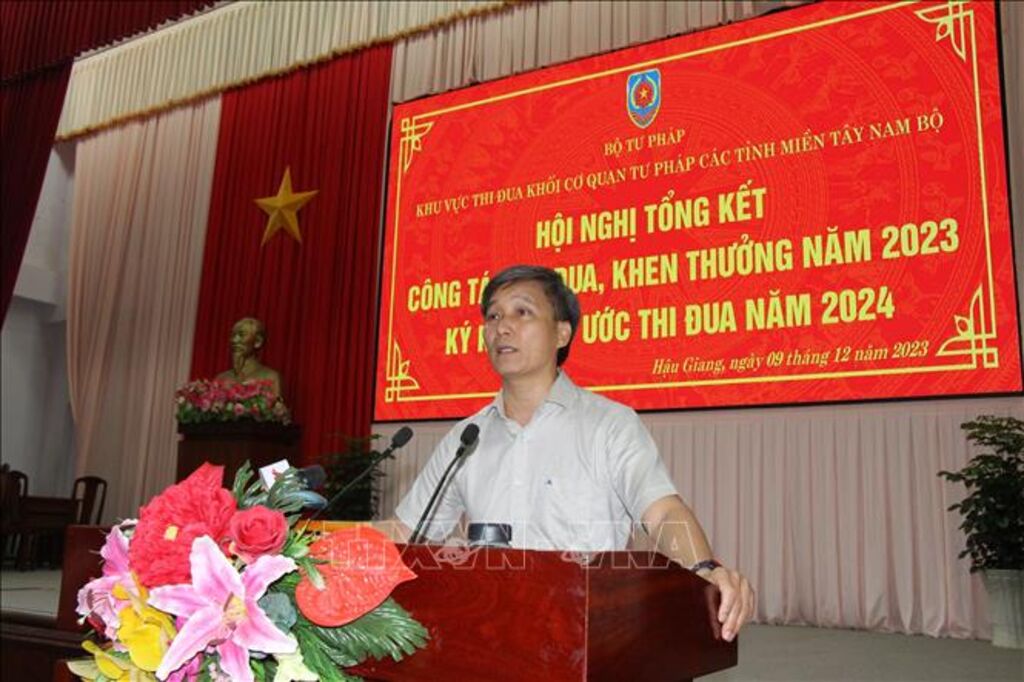 TTXVN - Ngày 9/12, tại tỉnh Hậu Giang, Khu vực thi đua Khối cơ quan Tư pháp các tỉnh miền Tây Nam Bộ (Bộ Tư pháp) tổ chức Hội nghị tổng kết công tác thi đua, khen thưởng năm 2023 và ký kết giao ước thi đua năm 2024.