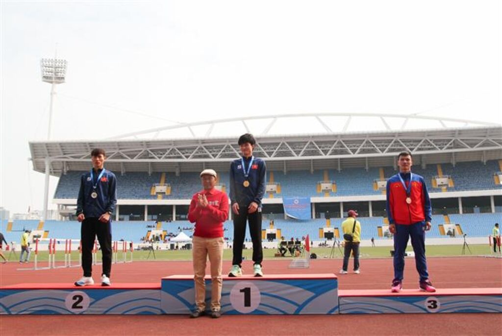 Nội dung 3.000m chướng ngại vật nam, huy chương Vàng Nguyễn Trung Cường (Hà Tĩnh), huy chương Bạc Lê Tiến Long (Hà Tĩnh), huy chương Đồng Đỗ Quốc Long (Quân đội). Ảnh: Nam Thái/TTXVN