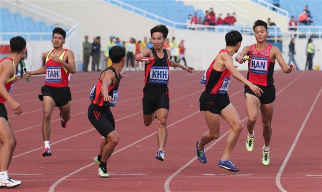 Các vận động viên tham gia nội dung tiếp sức 4x400m nam.Ảnh: Nam Thái/TTXVN