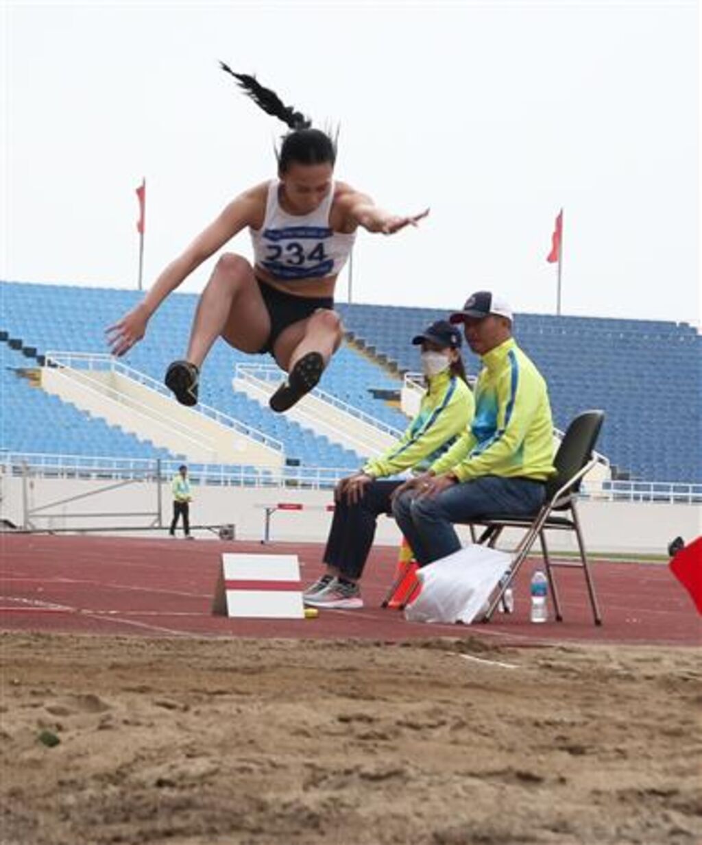 Các vận động viên tham gia nội dung nhảy xa nữ.Ảnh: Nam Thái/TTXVN