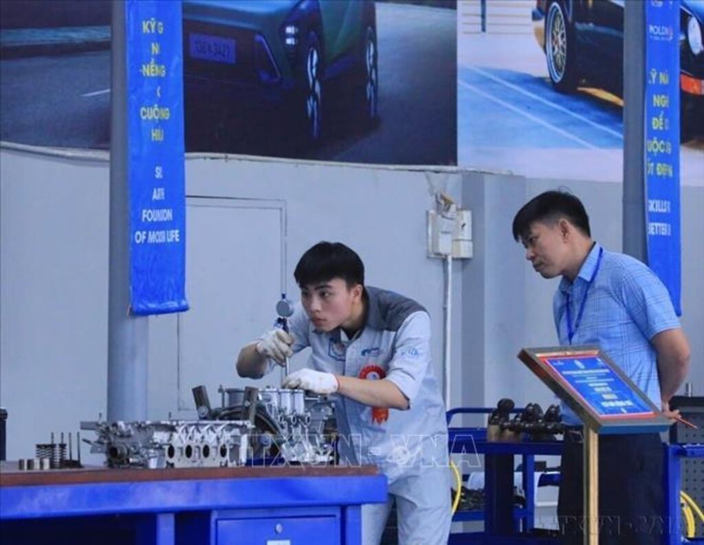 Phát huy lợi thế của thời kỳ cơ cấu "dân số vàng", đảm bảo nguồn lực cho sự phát triển nhanh, bền vững của đất nước thì điều kiện quan trọng và then chốt là cần nâng cao được chất lượng dân số, nâng cao chất lượng nguồn nhân lực. Trong ảnh:Thí sinh dự thi nghề Công nghệ ô tô - module “Cơ khí động cơ” tại Hội đồng thi số 3 - Trường Trung cấp nghề Giao thông công chính Hà Nội.