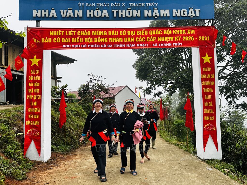 Trong khi đó, tại xã biên giới Thanh Thủy, từ sáng sớm, đông đảo cử tri đã nô nức đến các khu vực bỏ phiếu để thực hiện quyền và nghĩa vụ công dân của mình. Trên các tuyến đường dẫn về nhà văn hóa thôn, cờ đỏ sao vàng tung bay, băng rôn, khẩu hiệu được treo trang trọng, tạo nên không khí rộn ràng, phấn khởi nơi vùng biên.