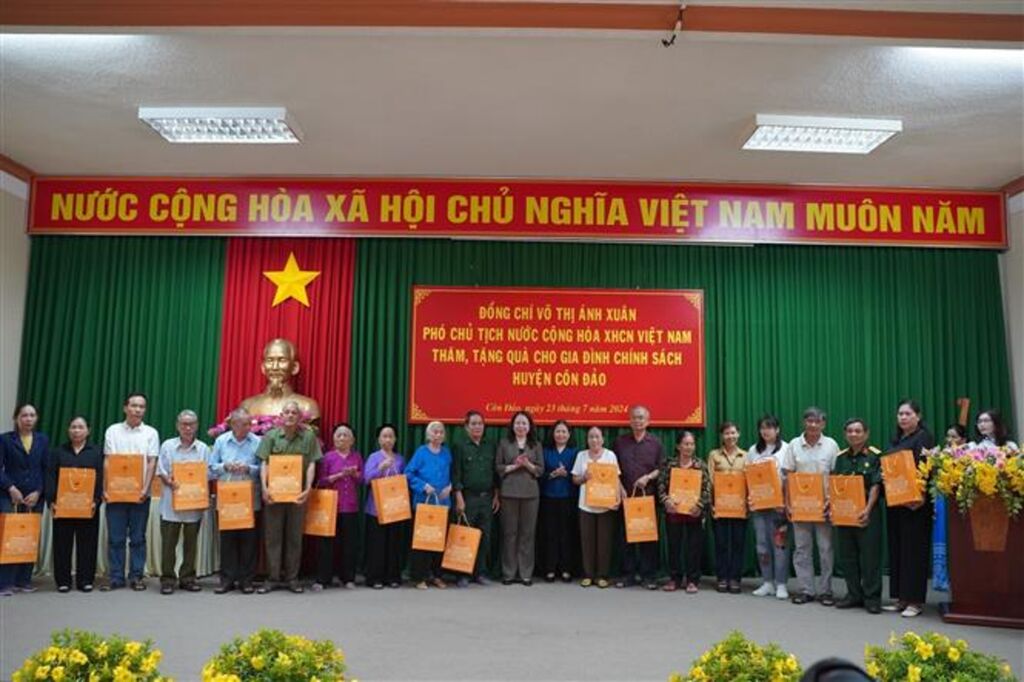Trong chương trình công tác tại huyện Côn Đảo, Phó Chủ tịch nước Võ Thị Ánh Xuân đã đến thăm, tặng quà 76 đối tượng chính sách, người có công, cựu tù chính trị đang sinh sống ở đây. Phó Chủ tịch nước thăm hỏi tình hình đời sống của các thành viên trong gia đình người có công, mong muốn mọi người tiếp tục phát huy truyền thống yêu nước để giáo dục con cháu, thế hệ trẻ cùng học tập, noi theo, chung sức xây dựng quê hương, đất nước ngày càng giàu đẹp./.