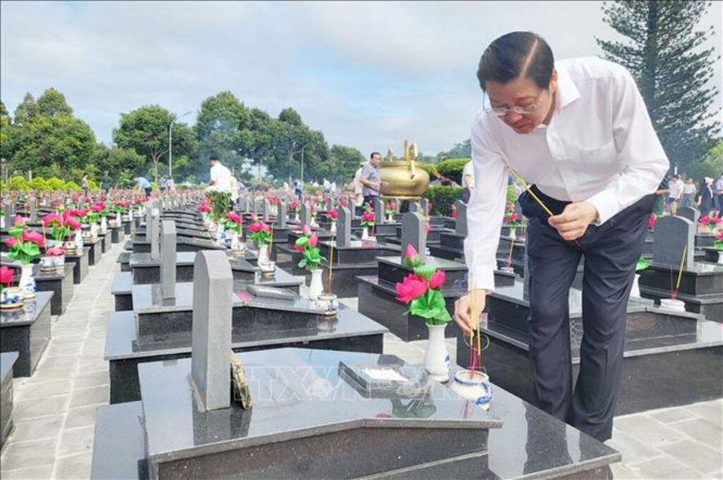TTXVN - Sáng 24/7, Đoàn công tác do Ủy viên Bộ Chính trị, Bí thư Trung ương Đảng, Trưởng Ban Nội chính Trung ương Phan Đình Trạc làm Trưởng đoàn, đến dâng hoa, dâng hương tại Nghĩa trang Liệt sỹ tỉnh Đắk Lắk, nhân kỷ niệm 76 năm Ngày Thương binh - Liệt sỹ (27/7/1947 - 27/7/2023).