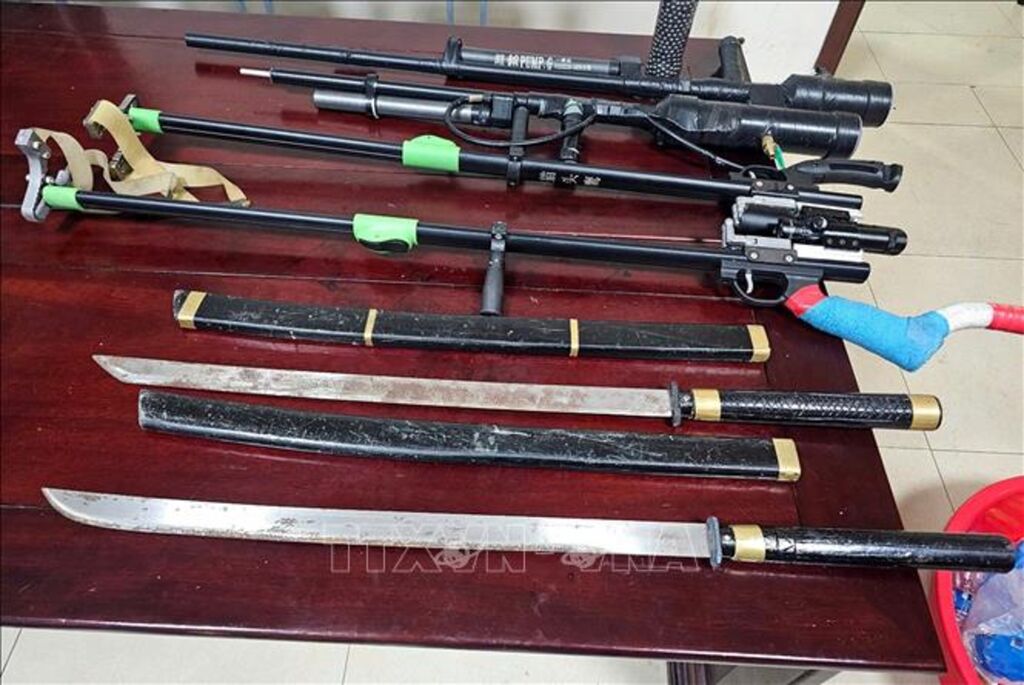 Quá trình bắt giữ, lực lượng chức năng thu và tạm giữ 3 khẩu súng cồn tự chế, 2 khẩu súng ná, 1 chai nhựa chứa đạn bi sắt, 4 thanh kiếm, 4 xe mô tô.
