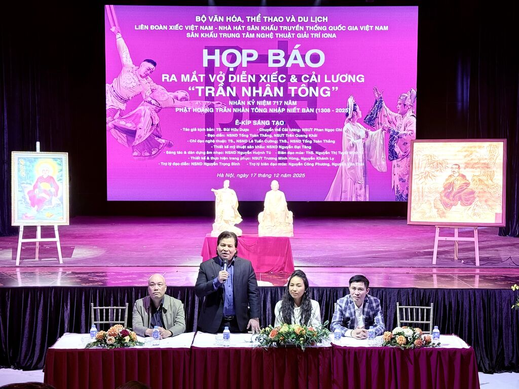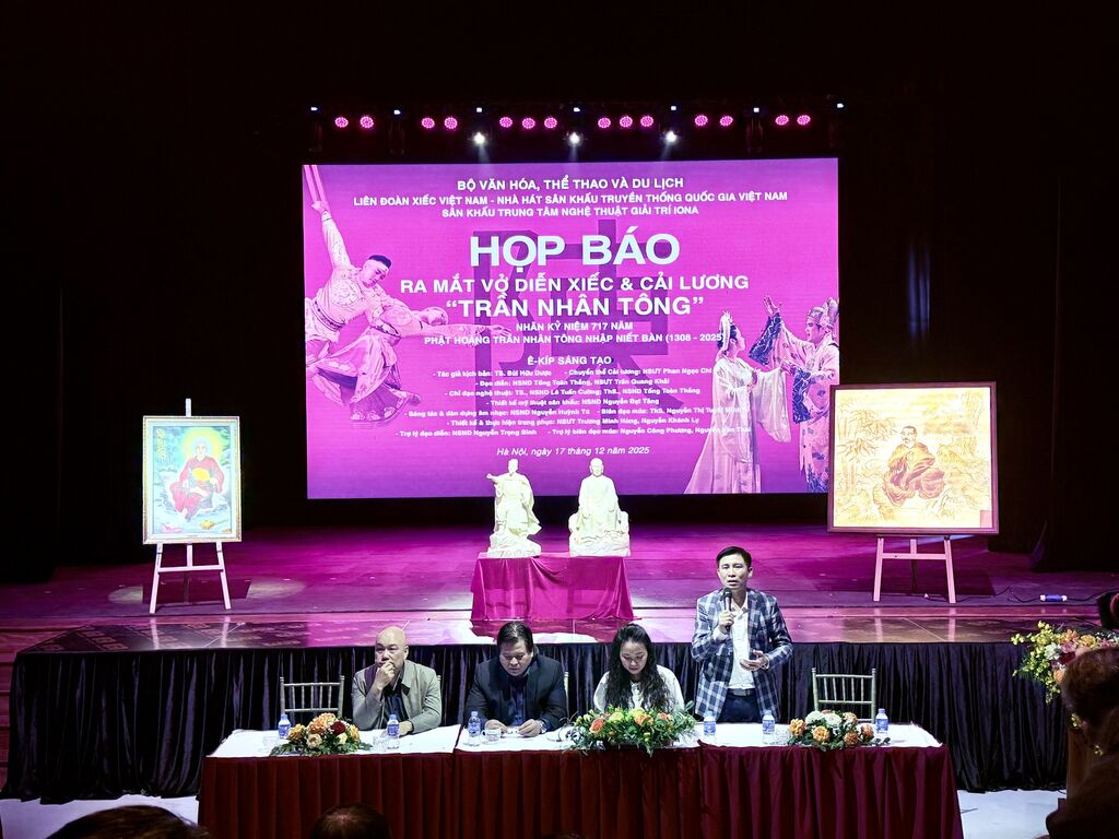 Vở diễn kết hợp giữa nghệ thuật Xiếc và Cải lương “Trần Nhân Tông” - tái hiện trọn vẹn và sinh động cuộc đời Đức Vua - Phật Hoàng Trần Nhân Tông sẽ chính thức công diễn phục vụ công chúng vào lúc 20 giờ các ngày 20, 21 và 28/12/2025, tại sân khấu vuông - Rạp Xiếc Trung Ương (Trung tâm Nghệ thuật Giải trí IONAH), nhân kỷ niệm 717 năm Phật Hoàng Trần Nhân Tông nhập Niết bàn (1308 - 2025). Thông tin trên được ê kíp thực hiện cho biết tại họp báo ra mắt vở diễn chiều 17/12 tại Hà Nội.