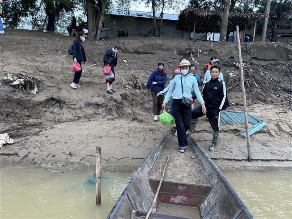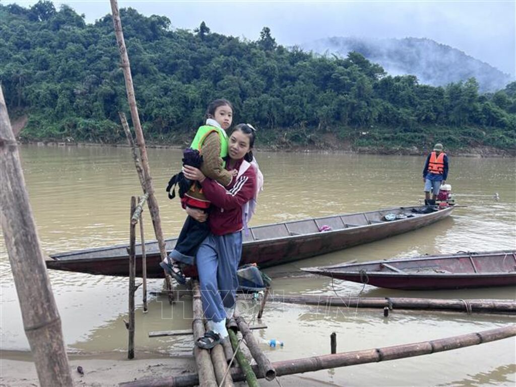 Tại xã Lượng Minh, Công an xã hỗ trợ hàng trăm học sinh qua sông đến trường an toàn do cầu treo Xốp Mạt bị lũ cuốn trôi.