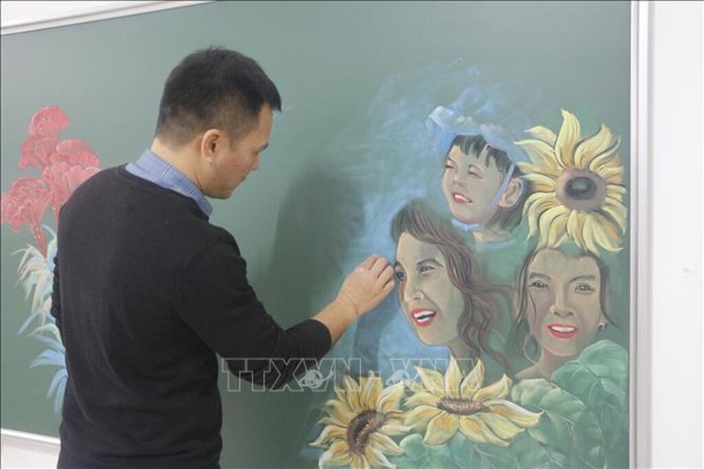 Chỉ với viên phấn màu và chiếc bảng đen đơn giản, thầy giáo Nguyễn Trí Hạnh đã biến những vật dụng phục vụ giảng dạy trở thành những tranh vẽ đầy sống động.
