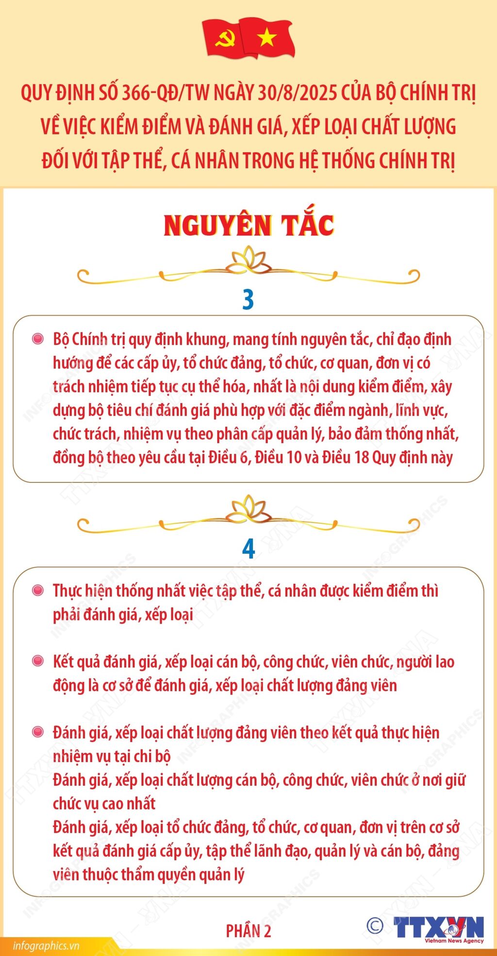 Quy định Số 366-QĐ/TW của Bộ Chính trị gồm 4 chương, 19 điều, quy định về mục đích, yêu cầu, nguyên tắc, nội dung cơ bản việc kiểm điểm, đánh giá, xếp loại chất lượng đối với tập thể, cá nhân trong hệ thống chính trị theo nhiệm kỳ, hằng năm, hằng quý hoặc khi cần thiết. -