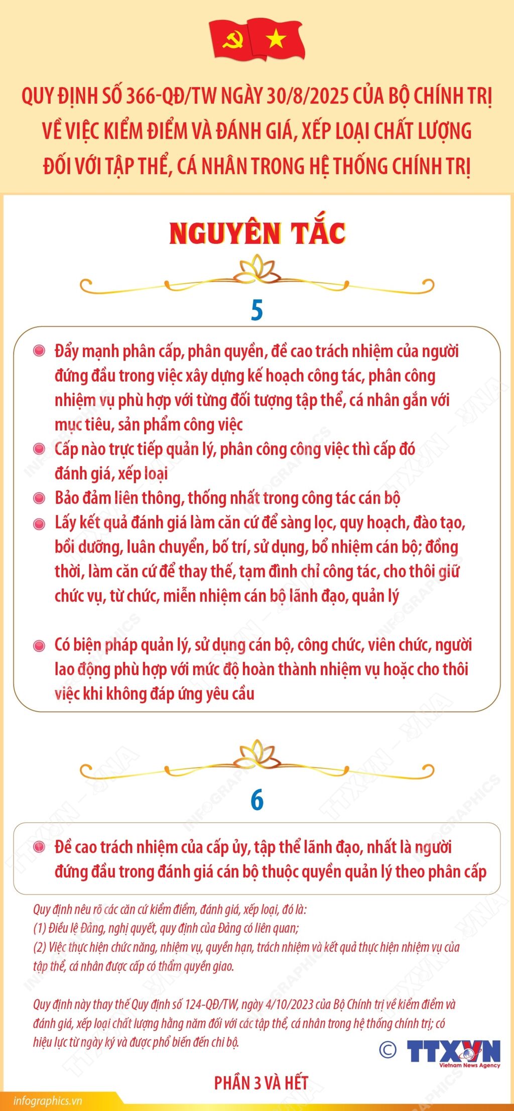Quy định Số 366-QĐ/TW của Bộ Chính trị gồm 4 chương, 19 điều, quy định về mục đích, yêu cầu, nguyên tắc, nội dung cơ bản việc kiểm điểm, đánh giá, xếp loại chất lượng đối với tập thể, cá nhân trong hệ thống chính trị theo nhiệm kỳ, hằng năm, hằng quý hoặc khi cần thiết. -