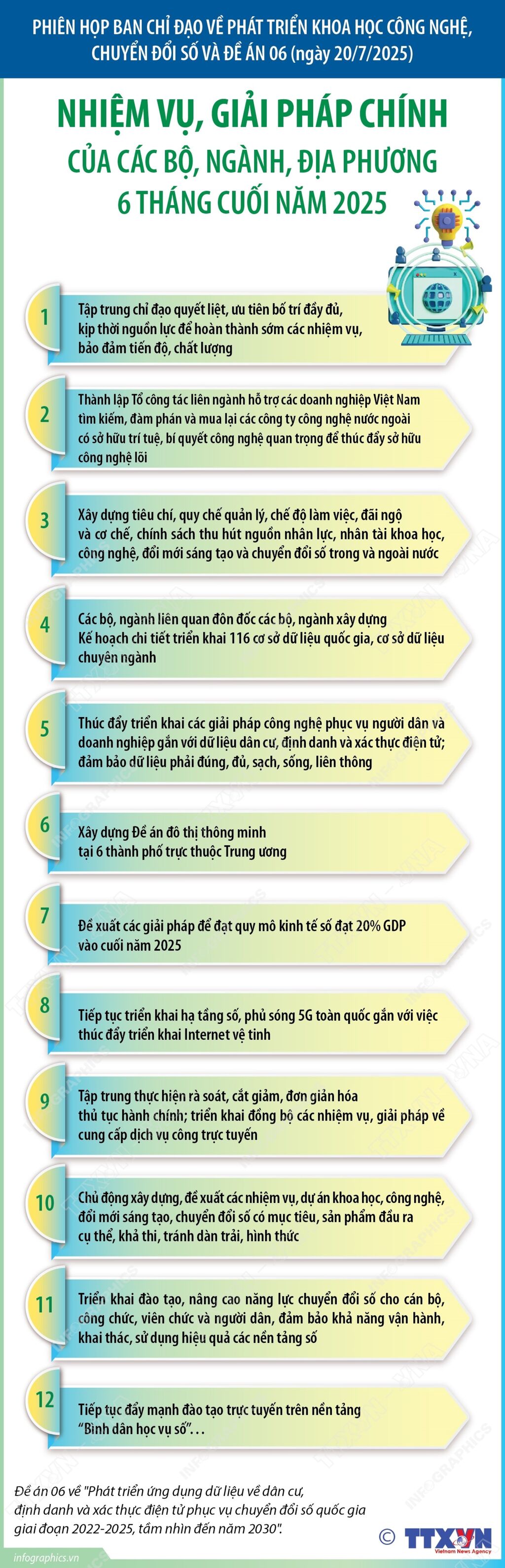 Sáng 20/7/2025, Thủ tướng Chính phủ Phạm Minh Chính, Trưởng Ban Chỉ đạo của Chính phủ về phát triển khoa học, công nghệ, đổi mới sáng tạo, chuyển đổi số và đề án 06 (Ban Chỉ đạo), chủ trì Phiên họp thứ Ba của Ban Chỉ đạo để sơ kết công tác 6 tháng đầu năm, triển khai nhiệm vụ 6 tháng cuối năm 2025. Trong 6 tháng đầu năm, các bộ, ngành, địa phương đã hoàn thành 76/106 nhiệm vụ của Chương trình hành động thực hiện Nghị quyết 57. -