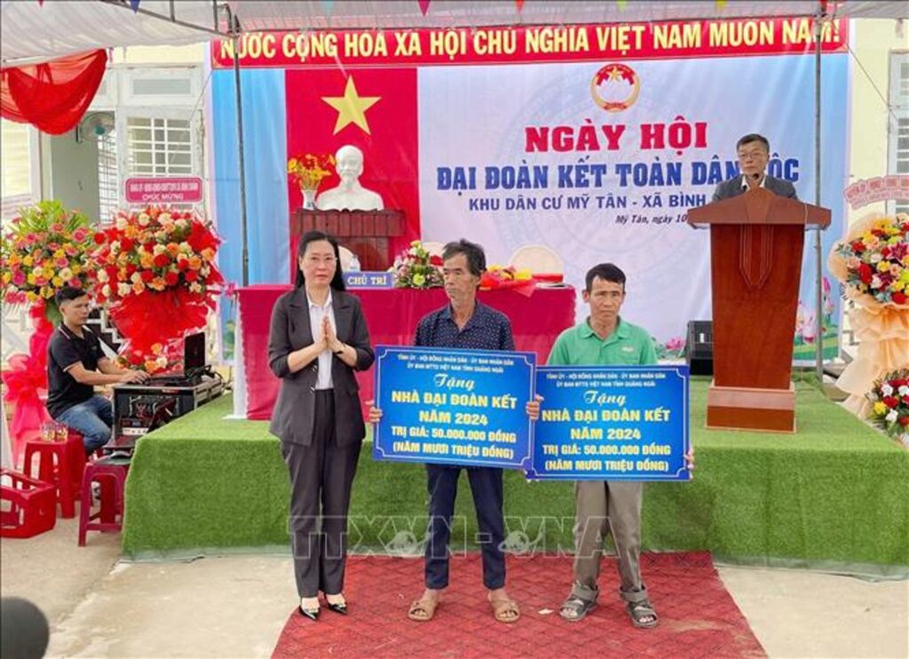 Dịp này, Tỉnh ủy, Bí thư Tỉnh ủy Quảng Ngãi đã trao nhà Đại đoàn kết cho hai hộ nghèo là gia đình bà Đặng Thị Dương thôn Đông Bình và bà Nguyễn Thị Thương thôn Mỹ Tân. Ban tổ chức cũng trao 45 suất quà cho hộ nghèo; Bằng khen của Ủy ban Mặt trận Tổ quốc Việt Nam tỉnh cho Khu dân cư Mỹ Tân và 10 hộ gia đình có thành tích xuất sắc trong Cuộc vận động Toàn dân đoàn kết xây dựng nông thôn mới, đô thị văn minh./.