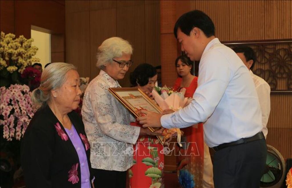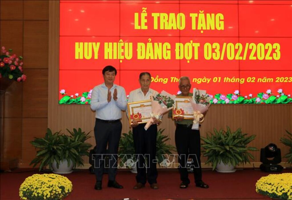 Các đảng viên cao niên tuổi Đảng tại Đồng Tháp nhận nhận Huy hiệu 60 năm tuổi Đảng. (Ảnh: Nhựt An/TTXVN)