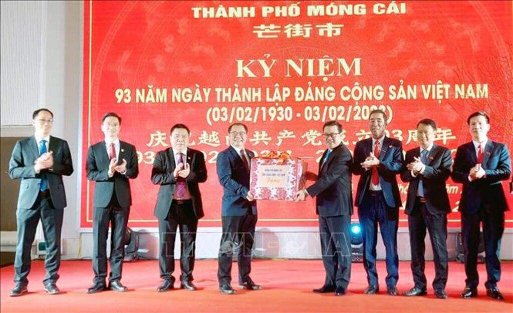Đoàn đại biểu Thành ủy Đông Hưng (Trung Quốc) sang chúc mừng, dự các hoạt động kỷ niệm 93 năm Ngày thành lập Đảng Cộng sản Việt Nam tại thành phố Móng Cái. (Ảnh: TTXVN phát)
