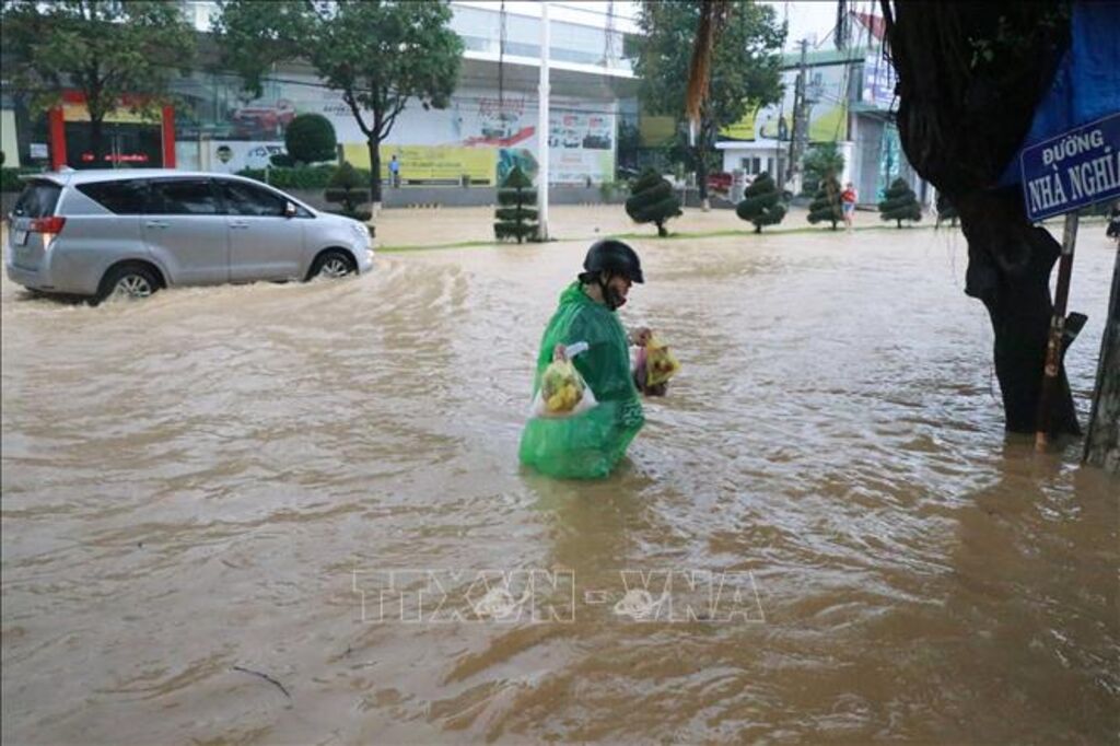 Nhiều tuyến đường trong khu dân cư thuộc các xã, phường như Vĩnh Trung, Vĩnh Thạnh, Ngọc Hiệp, Vĩnh Ngọc... của thành phố Nha Trang đều bị ngập hơn nửa mét, giao thông gặp nhiều khó khăn.