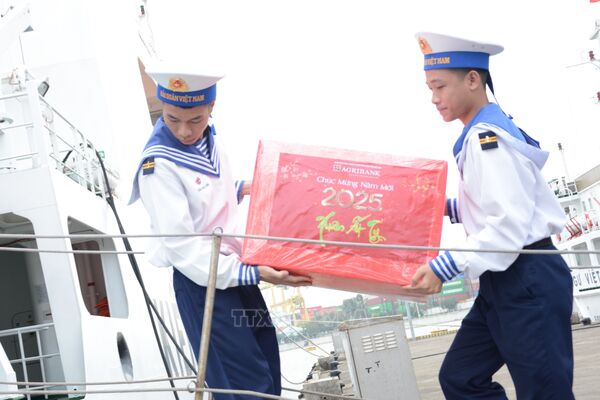 Nhiều phút đồng hồ qua đi trong cảm giác căng thẳng, hồi hộp, lo lắng… Tàu 390 và tàu cá dâng lên, thụt xuống theo những cơn sóng liên hồi. Sau nhiều nỗ lực, một ván gỗ dài đã được bắc qua 2 cầu. Những thùng quà Tết được bọc gói cẩn thẩn để ngăn nước biển được hải quân thả trượt theo ván gỗ. Bên kia, anh em tàu cá nhanh chóng đỡ từng thùng và xếp gọn dưới sàn tàu. Khi các thùng quà đã được chuyển hết sang tàu cá, mưa lớn hơn, sóng to hơn nên dù rất nỗ lực triển khai nhiều phương án, chỉ huy hành trình ra quyết định: Tháo dây thừng, quà Tết đến đảo, đại biểu ở lại tàu để đảm bảo an toàn.