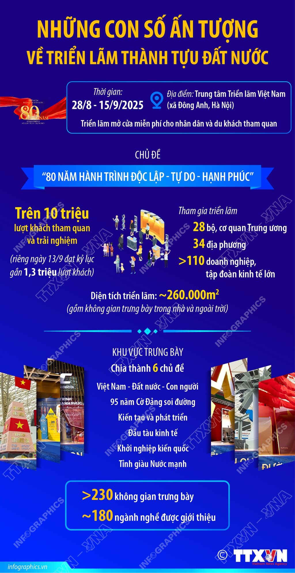 Triển lãm Thành tựu đất nước "80 năm hành trình Độc lập - Tự do - Hạnh phúc" đón trên 10 triệu lượt khách tham quan, trở thành một trong những triển lãm có số lượng người tham quan đông nhất từ trước tới nay.