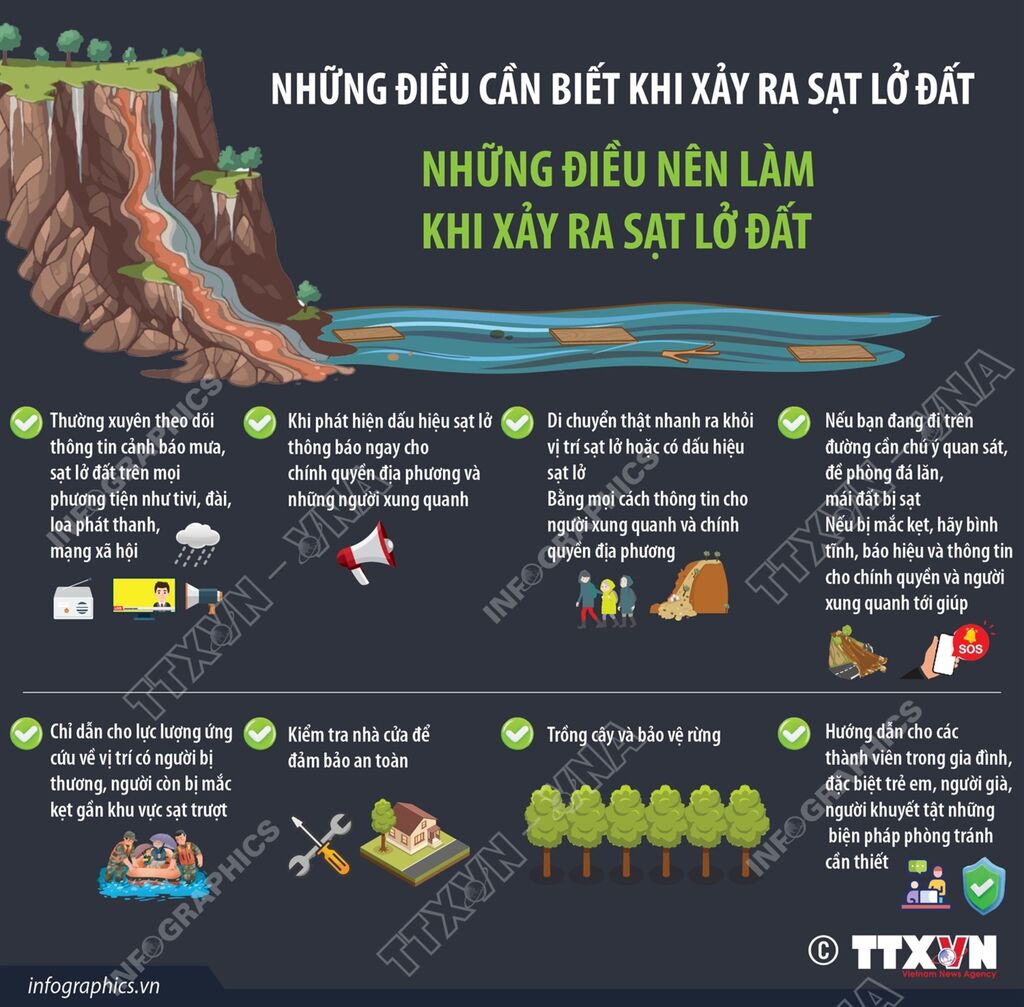 Mưa lớn kéo dài có nguy cơ gây ra sạt lở đất trên sườn dốc hay ven sông, suối, gây thiệt hại về người và tài sản. Vì vậy, người dân cần nâng cao ý thức phòng, tránh và hạn chế thiệt hại do sạt lở đất gây ra như: Thường xuyên theo dõi thông tin cảnh báo mưa, sạt lở đất trên các phương tiện như: Tivi, đài, loa phát thanh, mạng xã hội; Hướng dẫn cho các thành viên trong gia đình những biện pháp phòng tránh cần thiết; Khi phát hiện dấu hiệu sạt lở, thông báo ngay cho chính quyền địa phương và những người xung quanh, di chuyển thật nhanh ra khỏi vị trí sạt lở hoặc có dấu hiệu sạt lở, chỉ dẫn cho những người ứng cứu về vị trí có người bị thương, bị mắc kẹt gần khu vực sạt trượt.../.