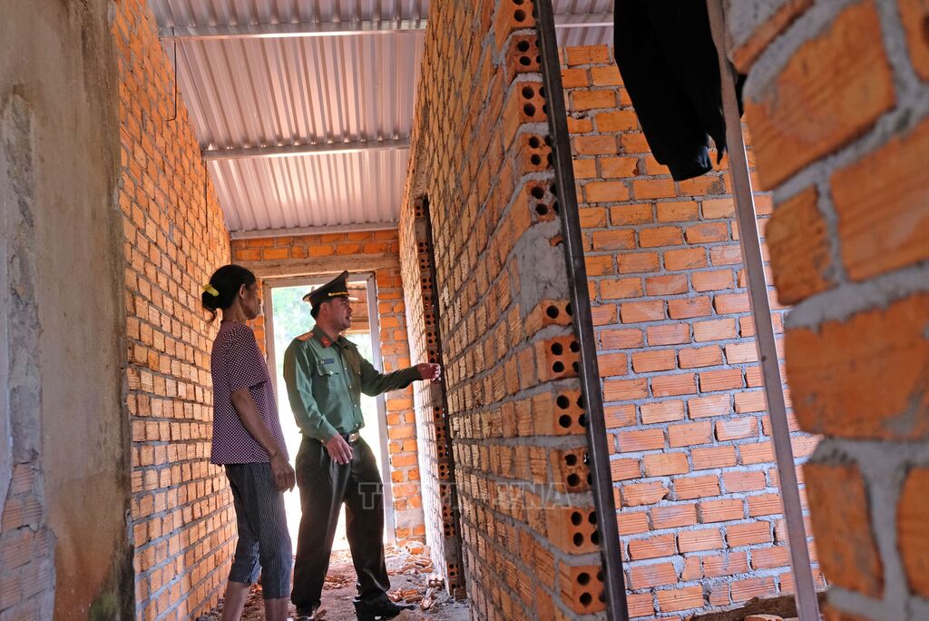 Chiều biên giới, nắng xuyên qua những triền đồi mắc-ca chớm nở, bà Thị D Rơu (55 tuổi, bon Bu Prăng 1, xã Quảng Trực) đang cẩn thận xếp gọn những chiếc chóe cũ vào một góc sân để dành chỗ cho thợ làm nhà. Cả gia đình 4 người phải đi ở nhờ bấy lâu, ước mơ có căn nhà riêng với bà Thị D Rơu đã sắp thành sự thật sau mấy chục năm chờ đợi. Bà Rơu xúc động nói: “Nhà mình thuộc hộ nghèo, chỉ đủ tiền ăn nên không dám nghĩ có ngày đủ tiền để xây nhà riêng. Cũng may được bên Công an xã hỗ trợ tiền làm căn nhà mới nên từ nay đã có chỗ che mưa, che nắng cho cả gia đình”.