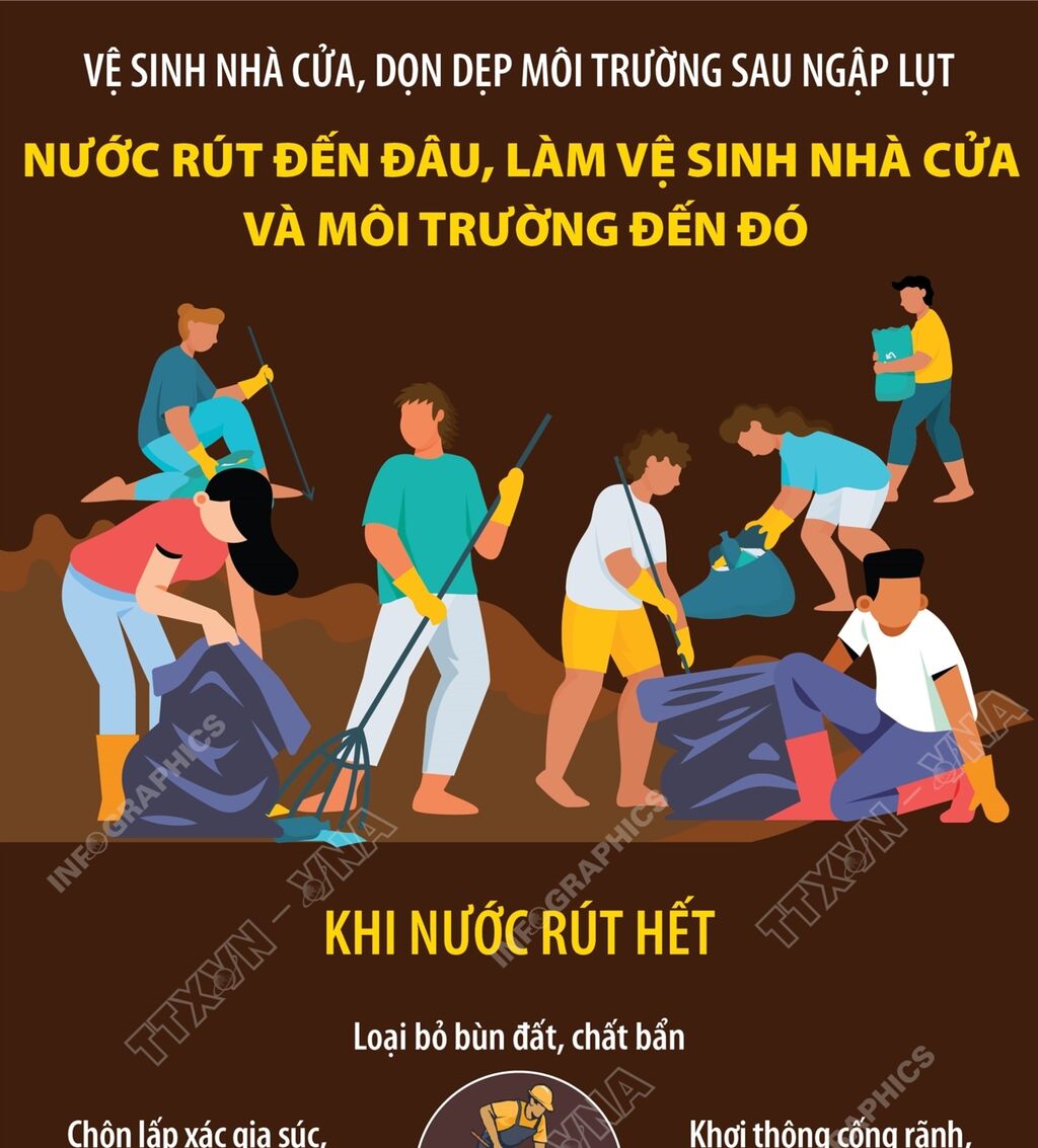 Để xử lý môi trường sau ngập lụt, người dân cần thực hiện “nước rút đến đâu, làm vệ sinh nhà cửa và môi trường đến đó”. Loại bỏ bùn đất, chất bẩn ra khỏi nhà, tường, đồ đạc, vật dụng, sân, đường đi; dọn dẹp, vệ sinh nhà cửa, phơi khô quần áo, đồ dùng, vật dụng; khơi thông cống rãnh, lấp các vũng nước đọng, phát quang các bụi rậm quanh nhà; thu gom rác thải, chất thải, xác súc vật chết để xử lý, chôn lấp và tẩy uế theo quy định, tránh gây ô nhiễm nguồn nước…/.