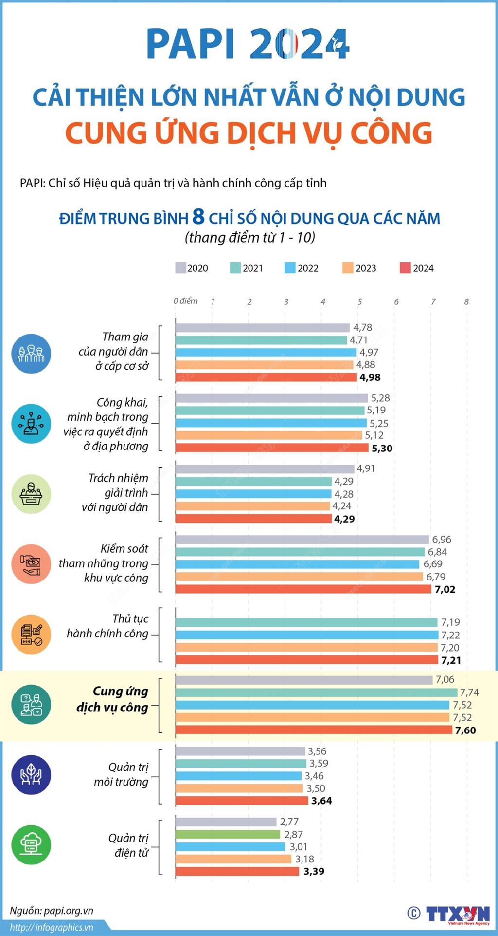 Lễ công bố Chỉ số Hiệu quả quản trị và hành chính công cấp tỉnh (PAPI) năm 2024 đã được tổ chức tại Hà Nội. Kết quả phân tích dữ liệu Chỉ số PAPI 2024 có những chuyển biến tích cực, đặc biệt ở nội dung Cung ứng dịch vụ công.
