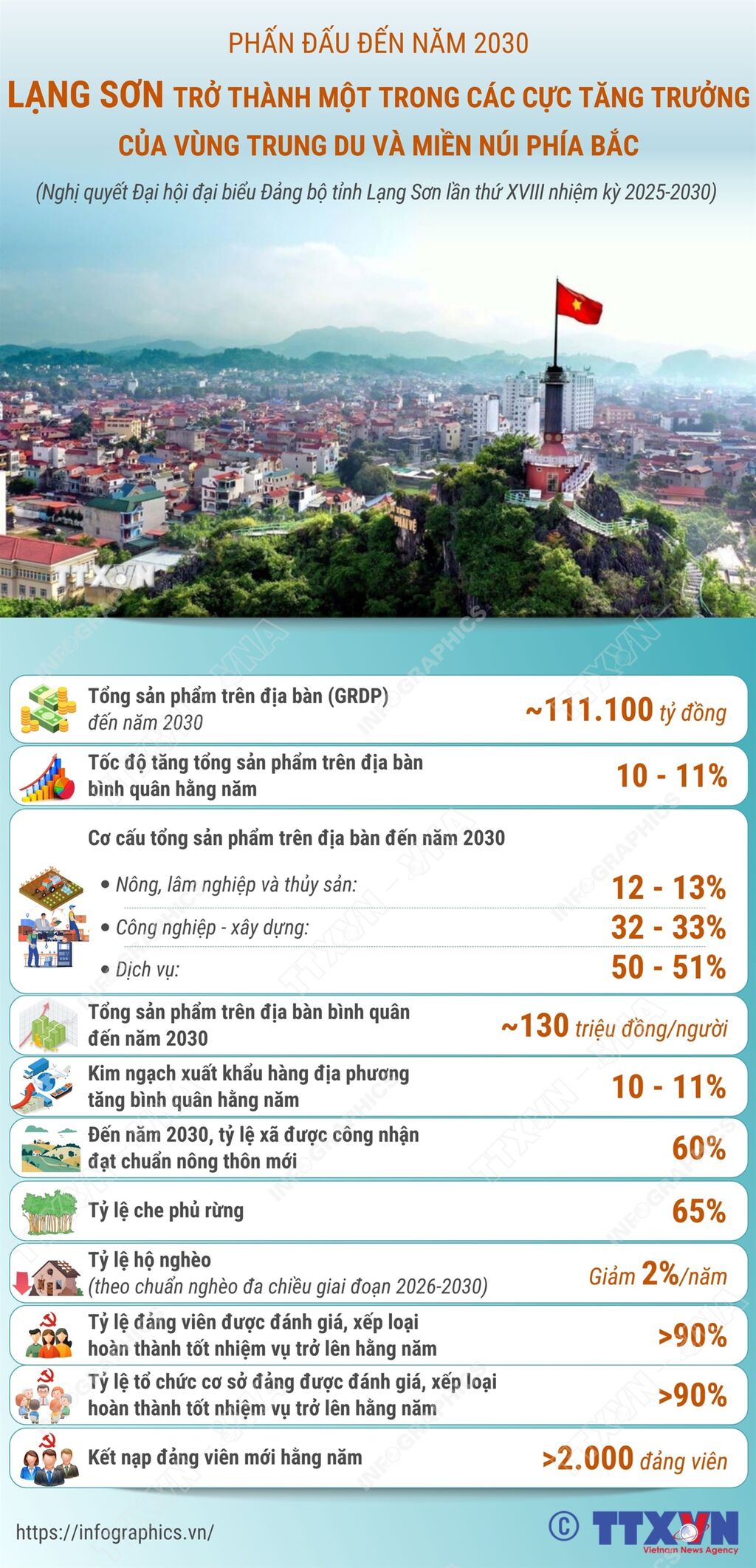Tỉnh Lạng Sơn phấn đấu đến năm 2030 , với GRDP đạt khoảng 111.100 tỷ đồng, tốc độ tăng trưởng bình quân 10–11%/năm, thu nhập bình quân đầu người đạt khoảng 130 triệu đồng/năm.