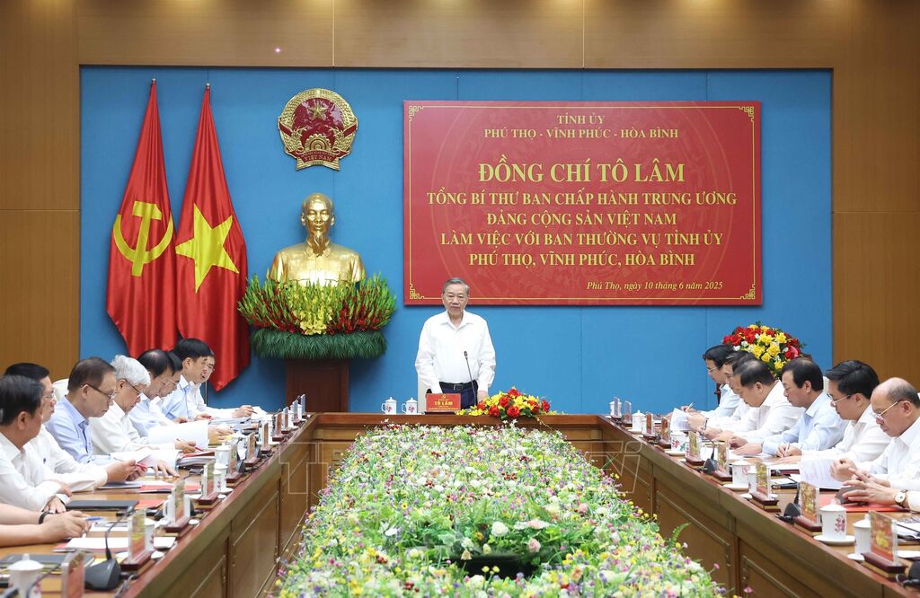 Sáng 10/6, tại Phú Thọ, Tổng Bí thư Tô Lâm và Đoàn công tác Trung ương đã làm việc với Ban Thường vụ Tỉnh ủy các tỉnh Phú Thọ, Vĩnh Phúc, Hòa Bình về tình hình triển khai thực hiện các nghị quyết, kết luận của Trung ương gần đây; việc sắp xếp tổ chức bộ máy của địa phương; công tác quốc phòng, an ninh; thực hiện nhiệm vụ tăng trưởng kinh tế và công tác bảo đảm an sinh xã hội.