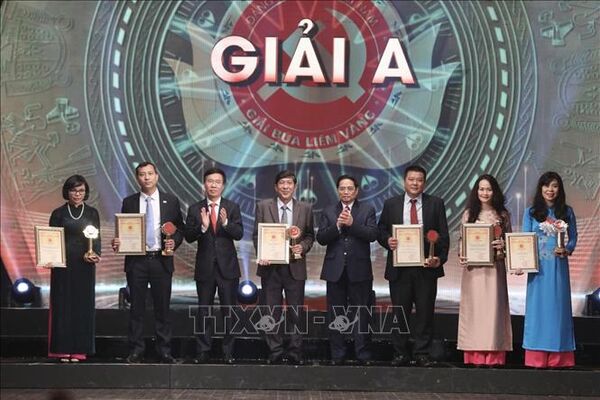 TTXVN - Tối 3/2, tại Nhà hát Lớn Hà Nội, nhân kỷ niệm 93 năm Ngày thành lập Đảng Cộng sản Việt Nam, Ban Tổ chức Trung ương chủ trì, phối hợp với Báo Nhân Dân, Tạp chí Cộng sản, Đài Truyền hình Việt Nam, Hội Nhà báo Việt Nam tổ chức Lễ công bố và trao Giải báo chí toàn quốc về xây dựng Đảng (mang tên Búa liềm vàng) lần thứ VII - năm 2022.