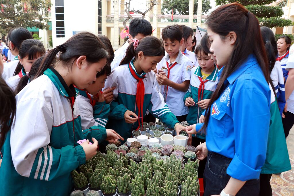 Giữa sân trường, hơn 700 học sinh háo hức chờ đợi chương trình diễn ra. Bên cạnh mỗi em đều có một bọc phế liệu được chuẩn bị ngay ngắn là sách báo cũ, chai nhựa, vỏ lon đã qua sử dụng. Với một lượng phế liệu tương ứng, các em sẽ được đổi phiếu để nhận về những chậu cây nhỏ và được hướng dẫn trồng cây vào các vật dụng tái chế trong gia đình. Sau chương trình, Đoàn Thanh niên đã thu về trên 2.200 vỏ lon, hơn 600kg bìa, vở cũ, gần 80kg sắt, nhôm. Số tiền quy đổi được gần 4 triệu đồng.
