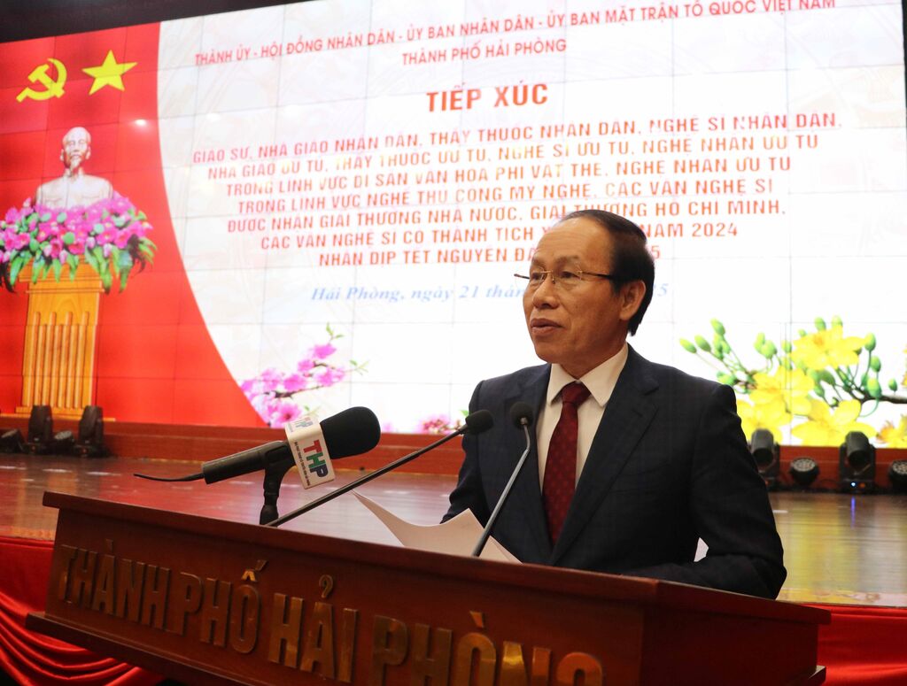Chiều 21/1, thành phố Hải Phòng tổ chức tiếp xúc hơn 400 Giáo sư, Nhà giáo Nhân dân, Thầy thuốc Nhân dân, Nghệ sĩ Nhân dân, Nhà giáo Ưu tú, Thầy thuốc Ưu tú, Nghệ sĩ Ưu tú, Nghệ nhân Ưu tú trong lĩnh vực di sản văn hóa phi vật thể; Nghệ nhân Ưu tú trong lĩnh vực thủ công mỹ nghệ; văn nghệ sĩ được nhận Giải thưởng Nhà nước, Giải thưởng Hồ Chí Minh và các văn nghệ sĩ có thành tích xuất sắc năm 2024 nhân dịp Tết Nguyên đán Ất Tỵ 2025.