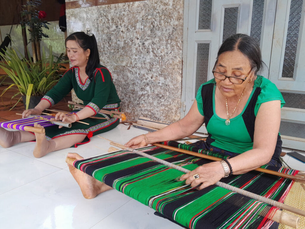 Tương tự, bà Thị Y Rơ (75 tuổi, thôn Bù Dốt) đã tuyền nghề dệt thổ cẩm cho 2 con gái và con dâu. Hiện nay, dù không còn nhanh nhẹn như trước nhưng bà Y Rơ vẫn dệt thổ cẩm mỗi khi sức khỏe ổn định và tích cực truyền lại kinh nghiệm cho các thế hệ con, cháu. Bà chia sẻ: “Tôi cũng không nhớ lúc biết dệt thổ cẩm từ khi nào nữa. Ảnh hưởng từ các bà, các mẹ, niềm đam mê thổ cẩm trong tôi được truyền cho các con đến bây giờ. Tôi mong muốn các con sẽ truyền lại nghề này cho các cháu để không bị mai một”.