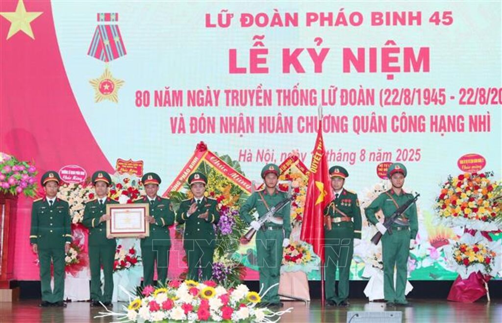 Tại buổi lễ, Ban Tổ chức đã công bố quyết định của Chủ tịch nước về việc trao tặng Huân chương Quân công hạng Nhì cho Lữ đoàn Pháo binh 45, vì đã có thành tích xuất sắc trong xây dựng Quân đội, củng cố quốc phòng, góp phần vào sự nghiệp xây dựng, bảo vệ Tổ quốc. Thừa ủy quyền của Quân ủy Trung ương, Bộ Quốc phòng, Thiếu tướng Nguyễn Hồng Phong, Tư lệnh Binh chủng Pháo binh đã gắn Huân chương Quân công lên Quân kỳ quyết thắng của đơn vị.