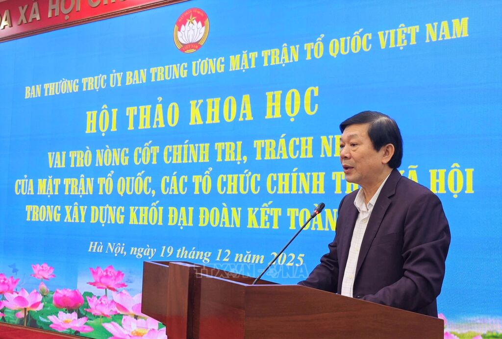 Sáng 19/12, tại Hà Nội, Ủy ban Trung ương Mặt trận Tổ quốc (MTTQ) Việt Nam tổ chức Hội thảo khoa học "Vai trò nòng cốt chính trị, trách nhiệm của Mặt trận Tổ quốc, các tổ chức chính trị - xã hội trong xây dựng khối đại đoàn kết toàn dân tộc".