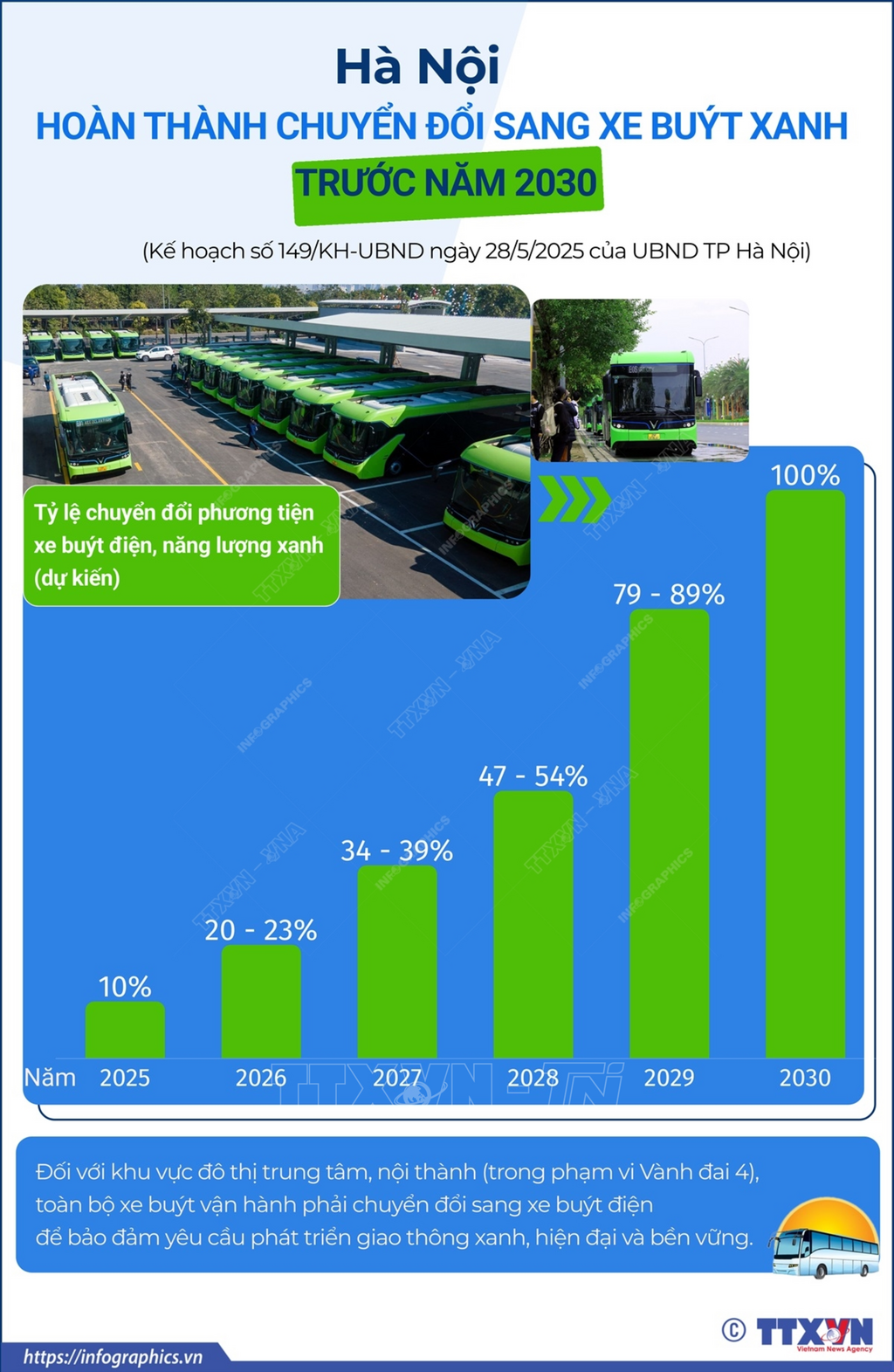 Chậm nhất đến năm 2030, thành phố Hà Nội sẽ hoàn thành công tác chuyển đổi phương tiện xe buýt sử dụng điện, năng lượng xanh trên toàn địa bàn thành phố.