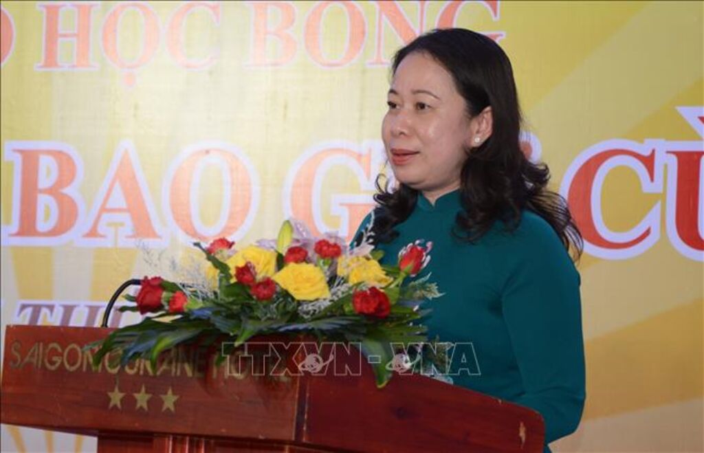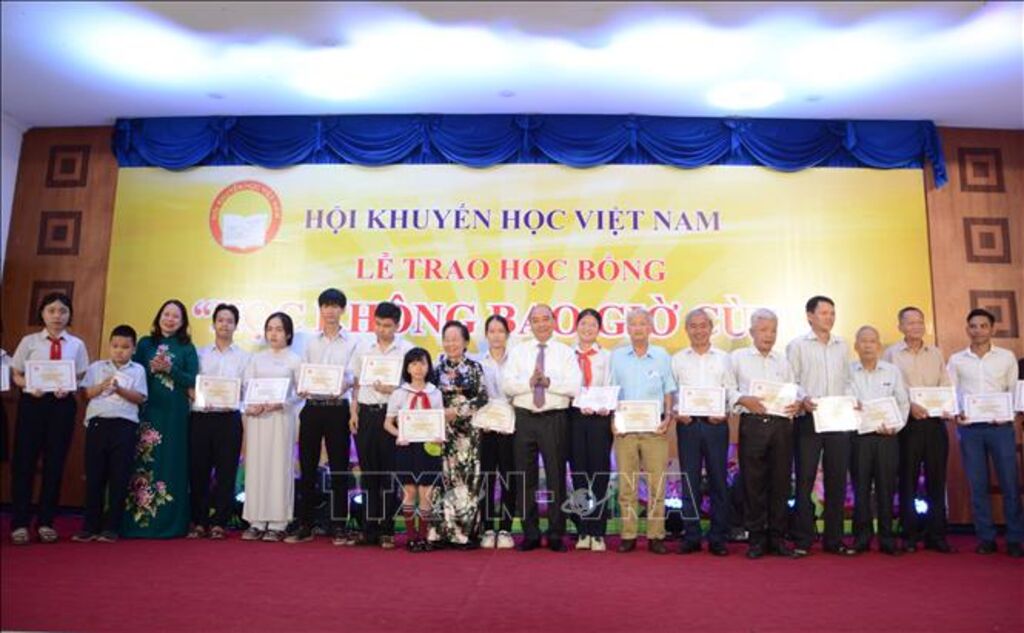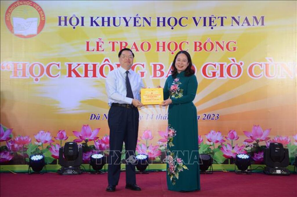 TTXVN - Sáng 14/7, Trung ương Hội Khuyến học Việt Nam tổ chức Lễ trao học bổng “Học không bao giờ cùng” lần thứ 3 cho các học sinh, sinh viên có thành tích xuất sắc trong học tập và người lớn có nhiều thành tích tiêu biểu trong học tập thường xuyên của 16 tỉnh, thành phố khu vực miền Trung - Tây Nguyên. Phó Chủ tịch nước Võ Thị Ánh Xuân đã dự lễ.