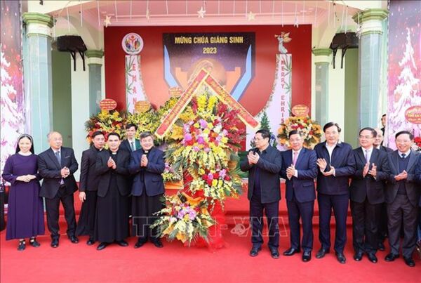 TTXVN - Chiều 23/12, Đoàn công tác của Đảng, Nhà nước, Ủy ban Trung ương Mặt trận Tổ Quốc Việt Nam do Ủy viên Bộ Chính trị, Phó Chủ tịch Thường trực Quốc hội Trần Thanh Mẫn làm Trưởng đoàn đã đến thăm, chúc mừng Giáng sinh năm 2023 tại Tòa Giám mục Giáo phận Vĩnh Long.
