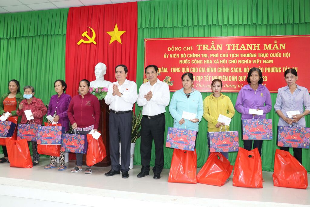 Dịp này, Phó Chủ tịch Quốc hội Trần Thanh Mẫn chúc Tết và trao tặng 50 phần quà cho các gia đình chính sách, hộ nghèo của phường Tân An, mỗi phần quà trị giá 1,5 triệu đồng.