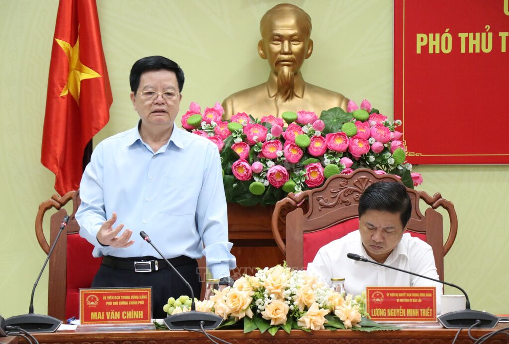 Phó Thủ tướng Mai Văn Chính yêu cầu tỉnh Đắk Lắk tiếp tục tháo gỡ các khó khăn trong thực hiện chính quyền địa phuơng hai cấp; cải thiện mạnh mẽ hơn nữa môi trường đầu tư, kinh doanh, cải cách thủ tục hành chính, tạo mọi điều kiện thuận lợi để kêu gọi doanh nghiệp đầu tư, phát triển doanh nghiệp, nhất là kêu gọi các tập đoàn, doanh nghiệp lớn đến đầu tư tại tỉnh. Tỉnh tập trung tháo gỡ điểm nghẽn, thúc đẩy cơ cấu lại nền kinh tế theo hướng tăng năng suất, chất lượng, hiệu quả và bền vững; quan tâm hơn nữa đến công tác an sinh xã hội và đời sống nhân dân vùng sâu, vùng xa, vùng đồng bào dân tộc thiểu số