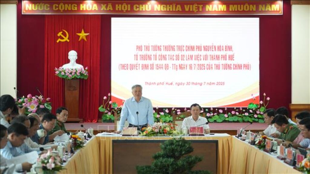 Chiều 30/7, Phó Thủ tướng Thường trực Chính phủ Nguyễn Hòa Bình dẫn đầu Đoàn công tác của Chính phủ đã làm việc với Ban Thường vụ Thành ủy Huế nhằm đánh giá tình hình phát triển kinh tế - xã hội, công tác vận hành mô hình chính quyền địa phương 2 cấp và định hướng đầu tư hạ tầng trọng điểm trên địa bàn.