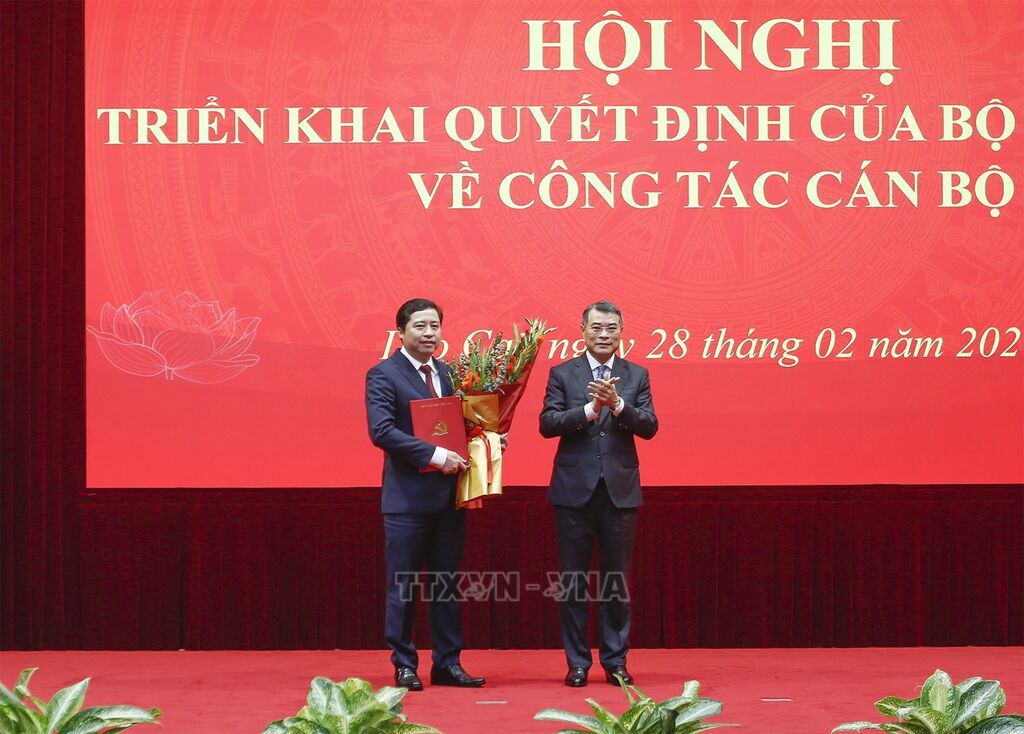 Ủy viên Bộ Chính trị, Bí thư Trung ương Đảng, Trưởng Ban Tổ chức Trung ương Lê Minh Hưng trao quyết định của Bộ Chính trị cho đồng chí Dương Quốc Huy.