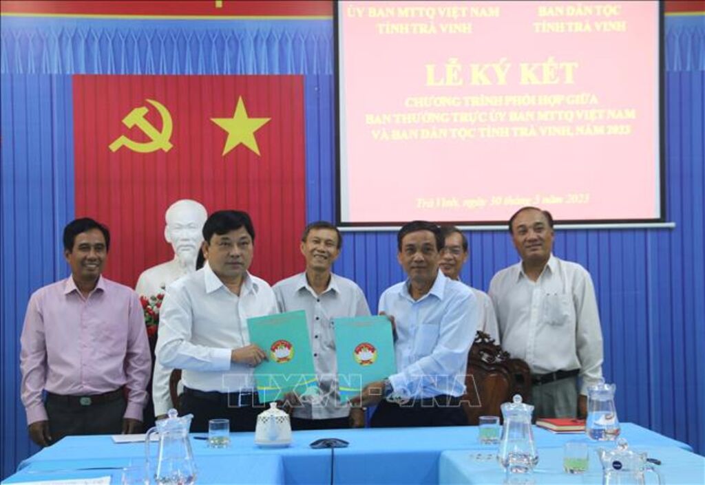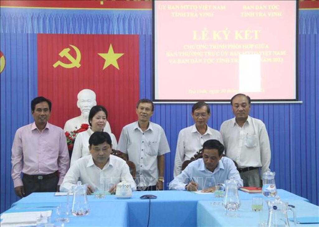 TTXVN - Chiều 30/5, Ban Thường trực Ủy ban Mặt trận Tổ quốc Việt Nam tỉnh và Ban Dân tộc tỉnh Trà Vinh đã ký kết Chương trình phối hợp tuyên truyền, thực hiện các chính sách phát triển vùng đồng bào dân tộc thiểu số.
