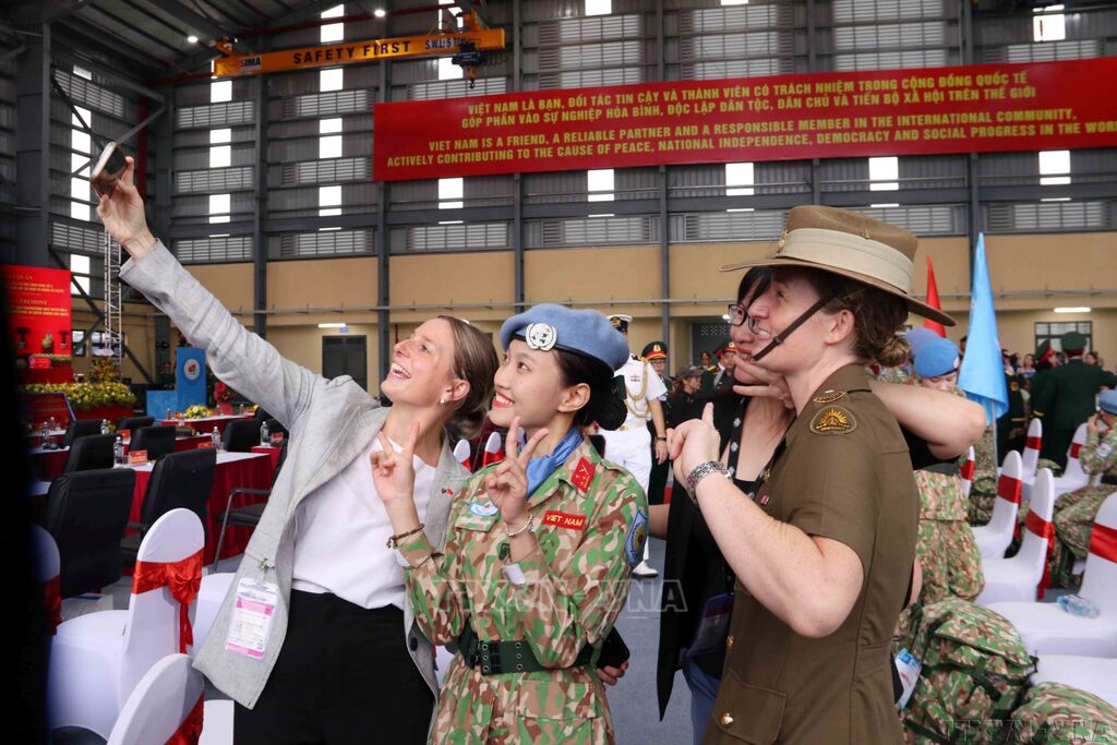 Các nữ chiến sỹ Bệnh viện cấp 2 số 7 bên những người bạn quốc tế tại Lễ xuất quân Bệnh viện dã chiến cấp 2 số 7 và Đội Công binh số 4 lên đường thực hiện nhiệm vụ gìn giữ hòa bình của Liên hợp quốc tại Phái bộ gìn giữ hòa bình của Liên hợp quốc tại Nam Xu-đăng (Phái bộ UNMISS) và Khu vực Abyei (Phái bộ UNISFA).