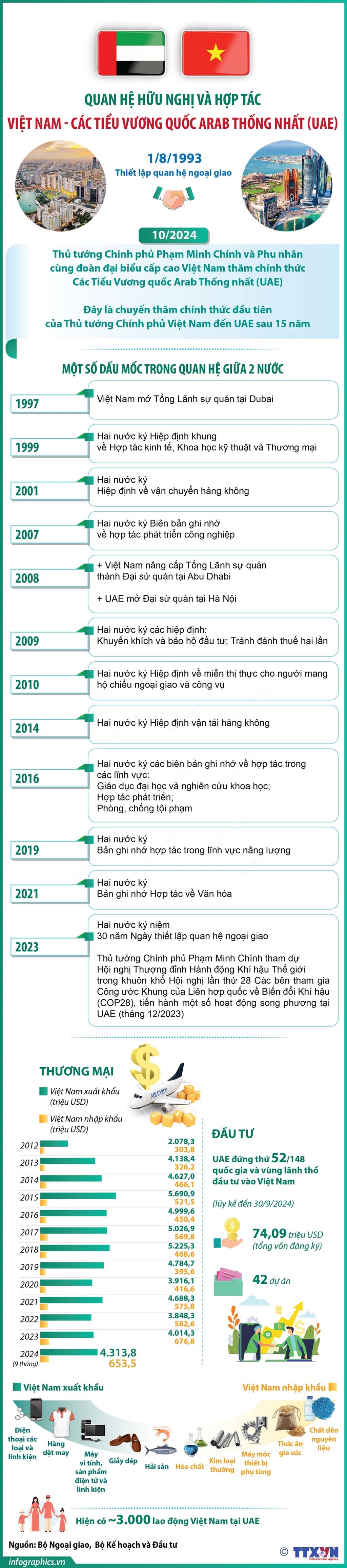 Từ ngày 27/10 đến 1/11/2024, Thủ tướng Chính phủ Phạm Minh Chính và Phu nhân cùng đoàn đại biểu cấp cao Việt Nam thăm chính thức Các Tiểu Vương quốc Arab Thống nhất (UAE); Nhà nước Qatar; tham dự Hội nghị Sáng kiến đầu tư tương lai lần thứ 8 và thăm làm việc Vương quốc Saudi Arabia. Trong đó, UAE là chặng dừng chân đầu tiên của Thủ tướng Phạm Minh Chính trong chuyến công tác lần này.